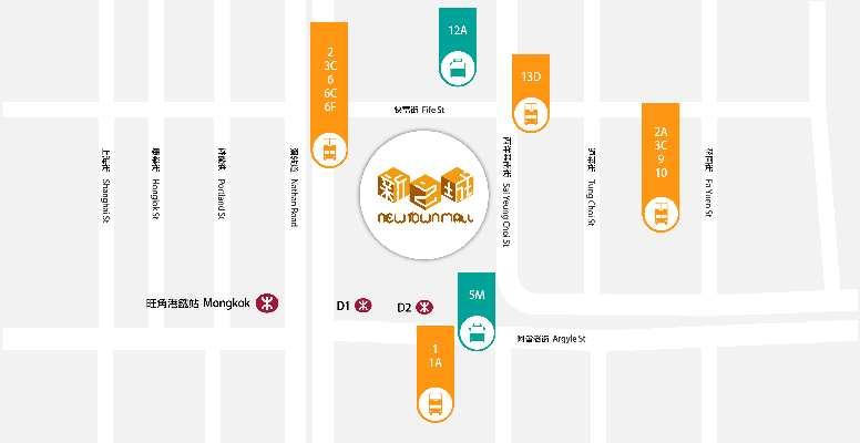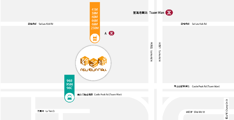(荃湾站巴士总站(南丰中心)/ 西楼角路,荃湾站 / 绿杨坊(潮江春楼下)/ 美环街,愉景新城公共运输交汇处) 再步行约10分钟